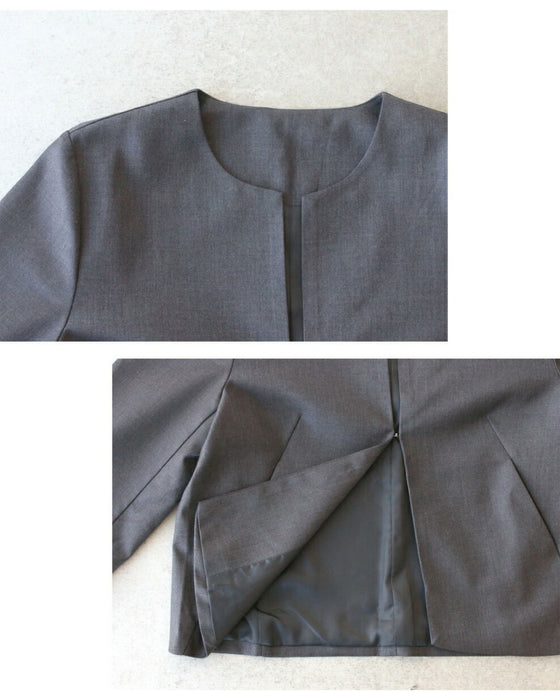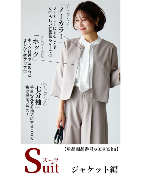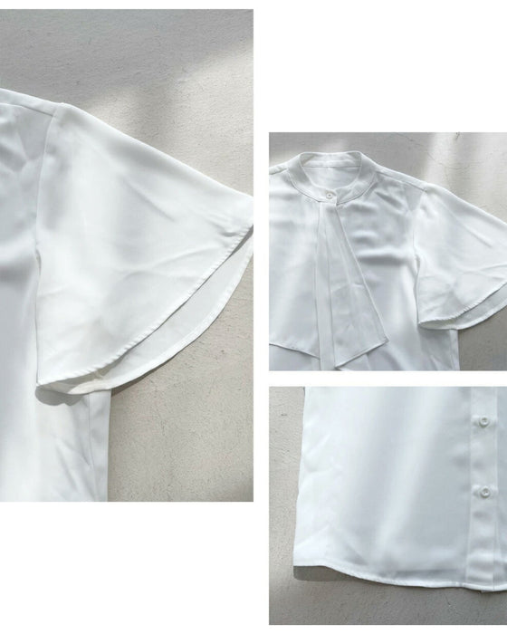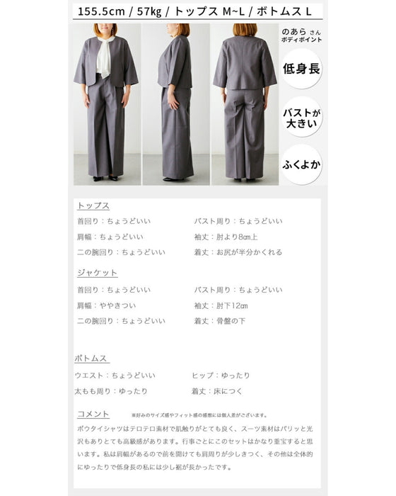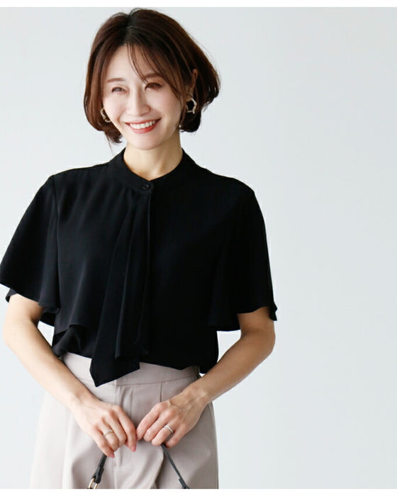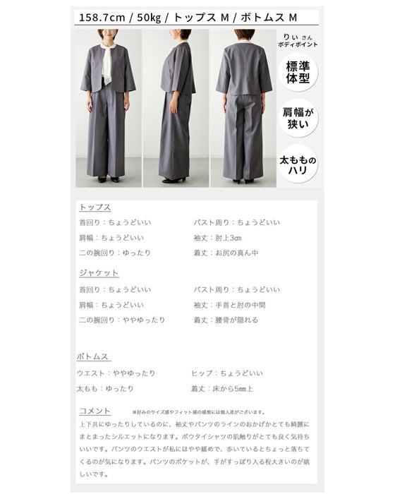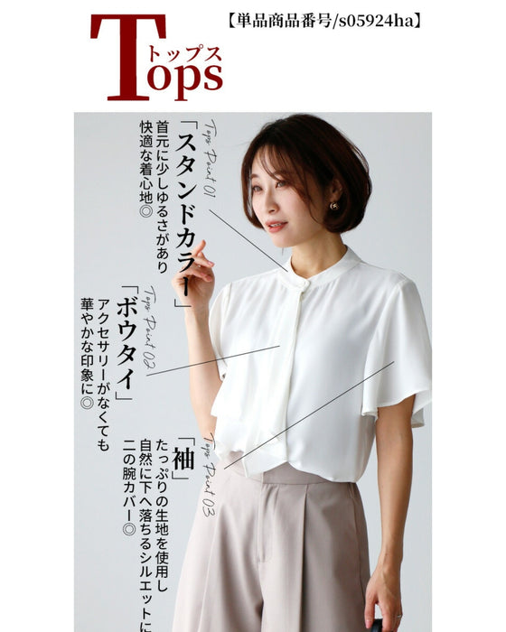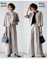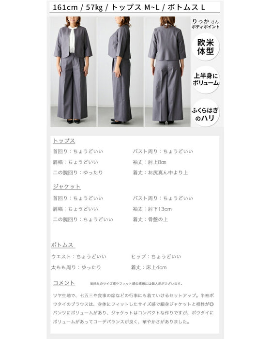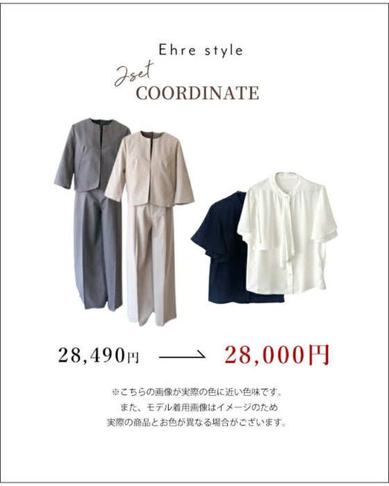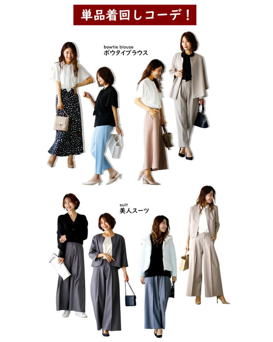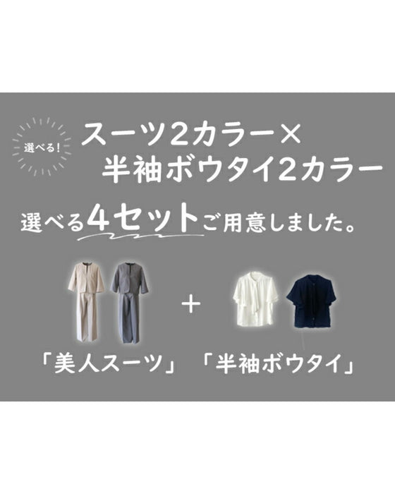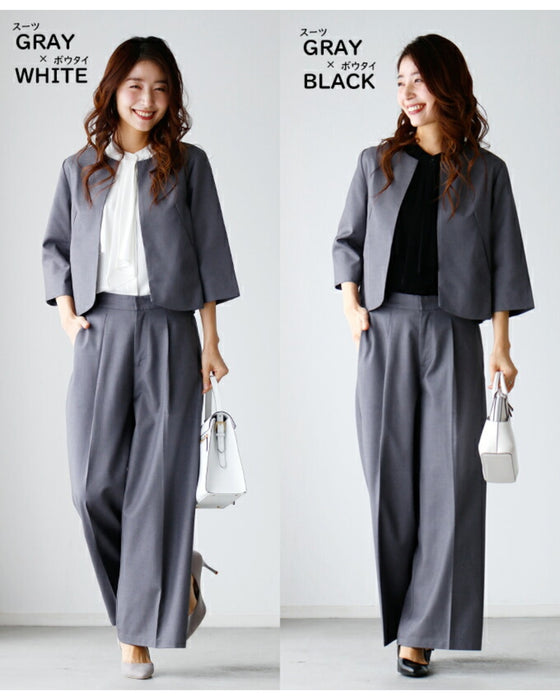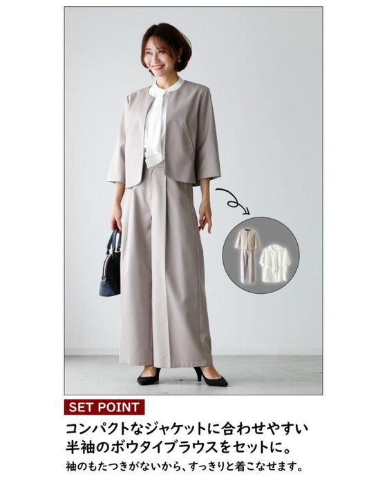 Set-up, suit, formal suit, short jacket, jacket, wide pants, suit, top, blouse, bowtie, short sleeve, clean, black, white, plain, simple, work, upper arm cover, Ehre style, petite, Ehrestyle, free size