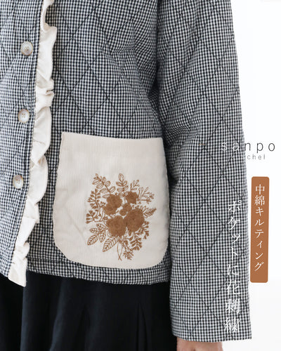 This quilted coat has floral embroidery on the pockets.