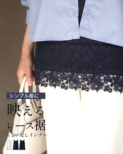 上品な花レースがTシャツやブラウスの下からのぞいて
