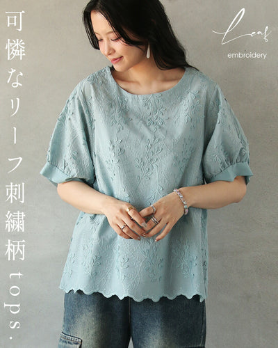 ■爽やかな淡いブルーと可憐なリーフ柄刺繍がマッチする オトナのキレイめカジュアルトップス。