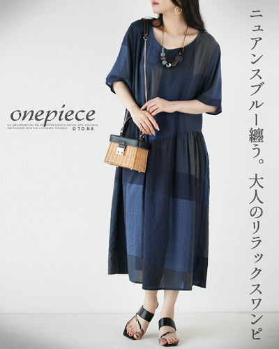 深みのあるニュアンスブルーのを活かした、大胆なブロックチェック柄が目を惹くワンピース。肩の力を抜いたリラックス感のあるシルエットと、裾に向かってふんわり広がるフレアデザインが女性らしい軽やかさを演出します。シンプルながらも個性が光る涼し気なワンピースです。