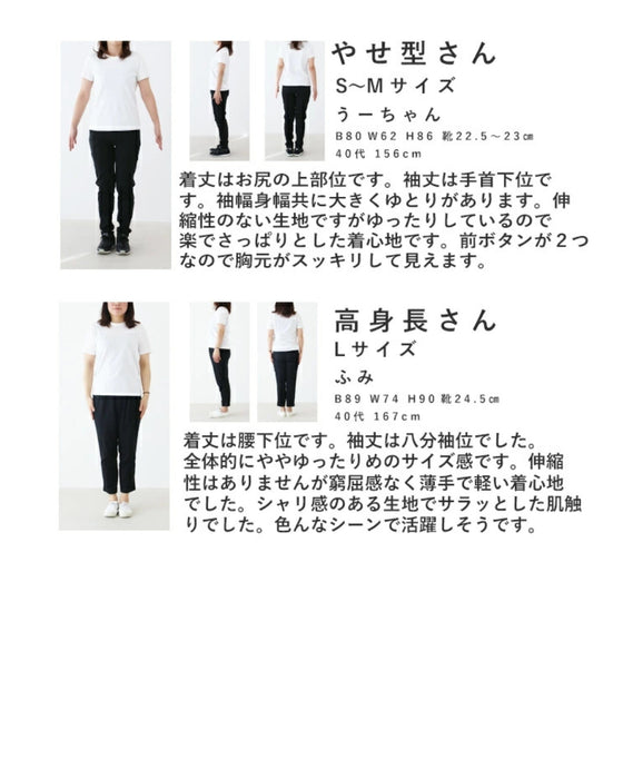 | Size | 肩幅 | 身幅 | ゆき丈 | 着丈 | 前下がり | 袖丈 | アームホール | 袖口 |