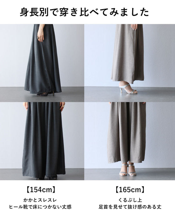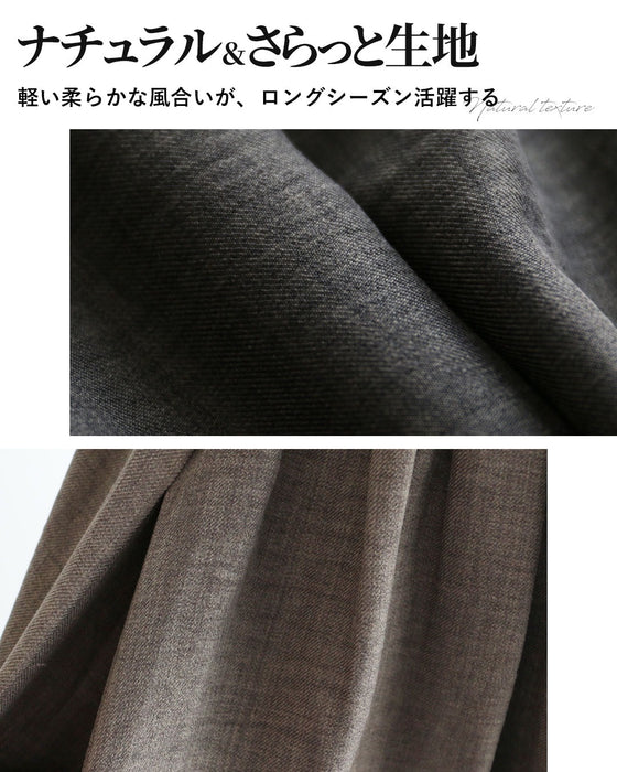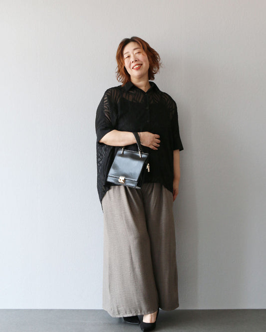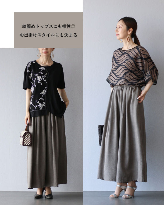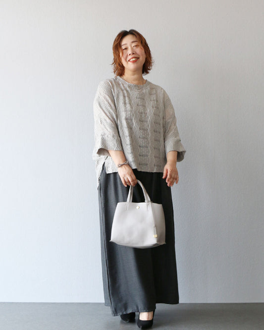 ナチュラルなさらっとした生地を使い、ゆったりとしたワイド感が体型をカバーしつつ、快適な着心地を提供します。