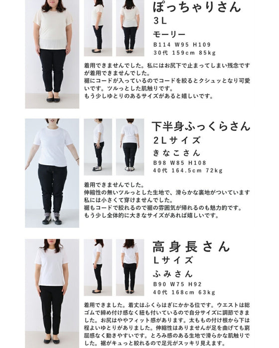 You can wear it comfortably without feeling any tightness on your body. You can tighten the cord at the hem so you don't have to worry about your feet. It's easy to walk, sit, squat, and do other movements, so you can be active. It's perfect for days when you're moving around a lot, or when traveling.