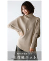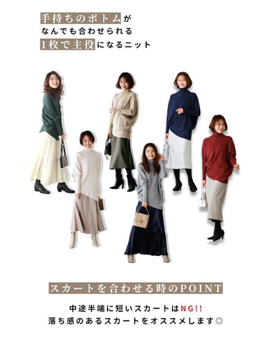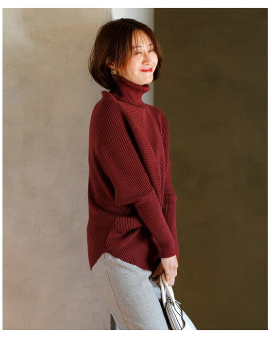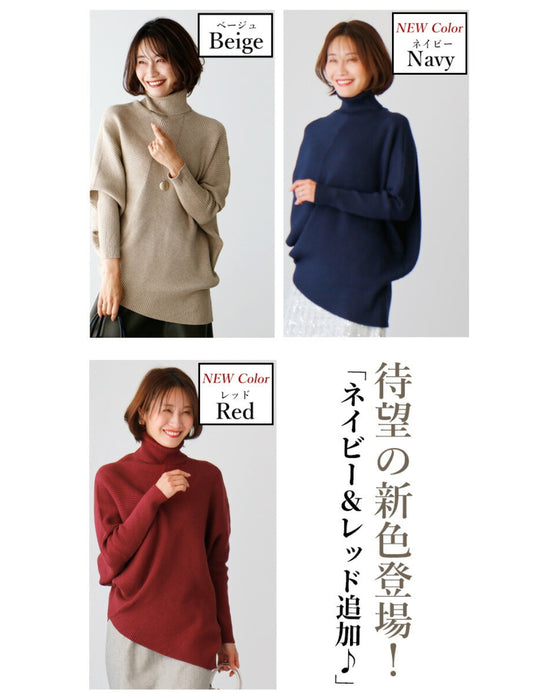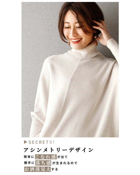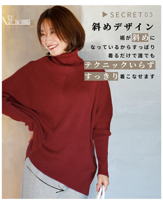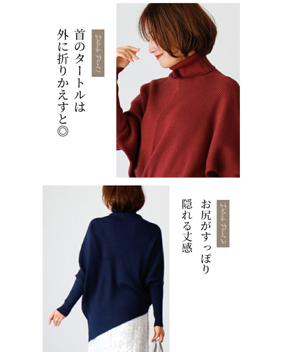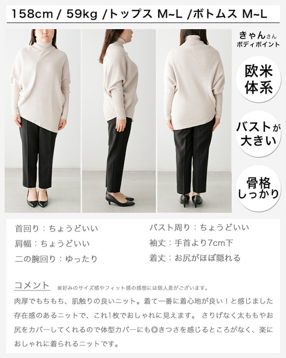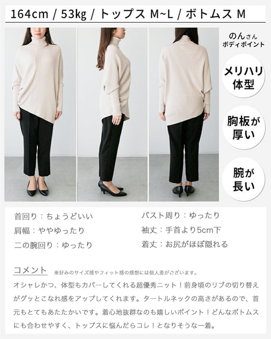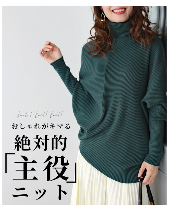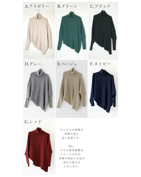 Asymmetrical, diagonal, turtleneck, knit, top, long sleeves, design knit, green, black, ivory, gray, beige, red, navy, black, green, gray, knit, autumn, winter, slimming, women's, unique, stylish, loose-fitting style, Ehre style, suitable for petite people, Ehrestyle