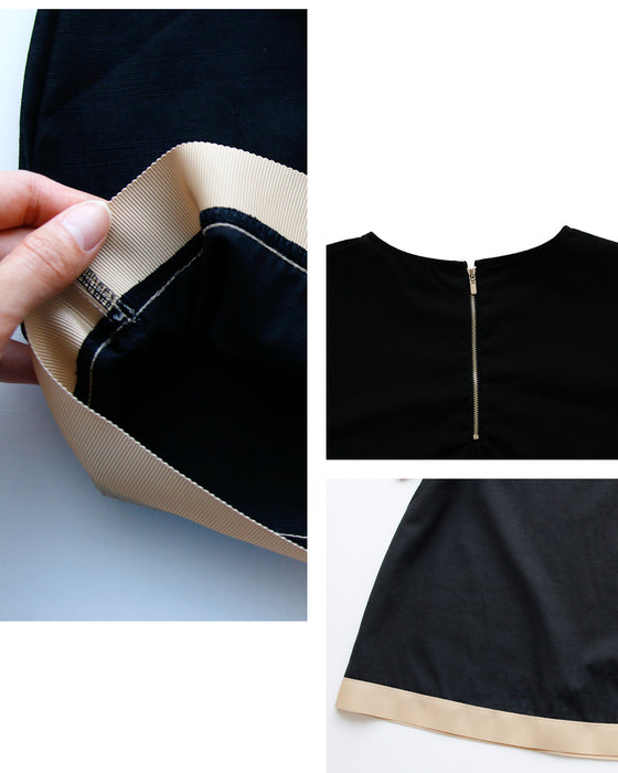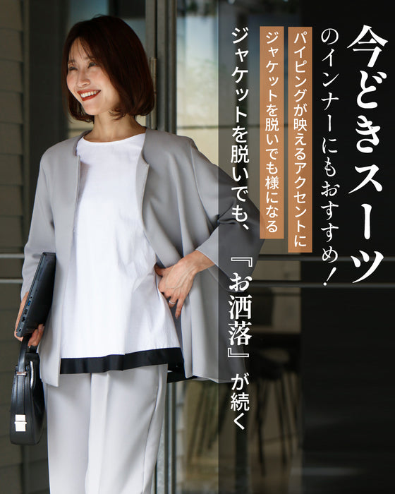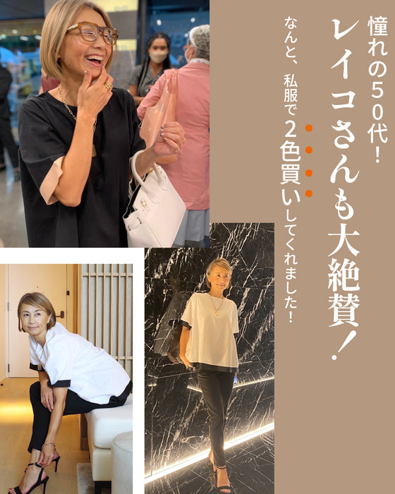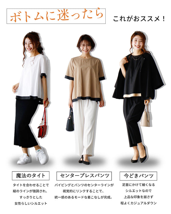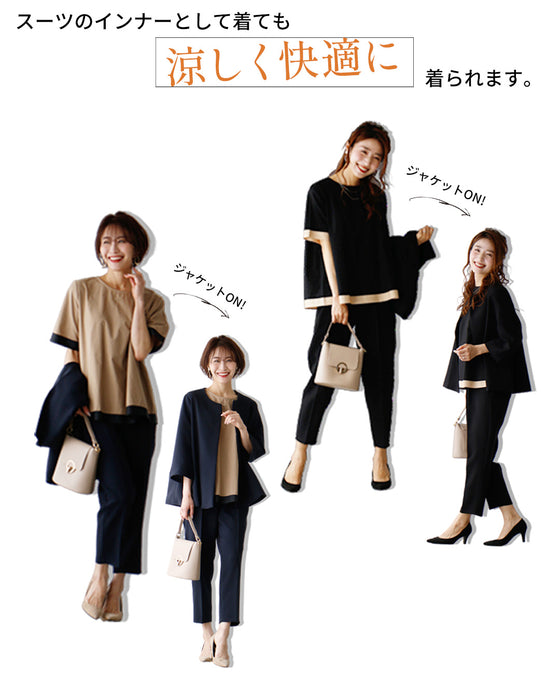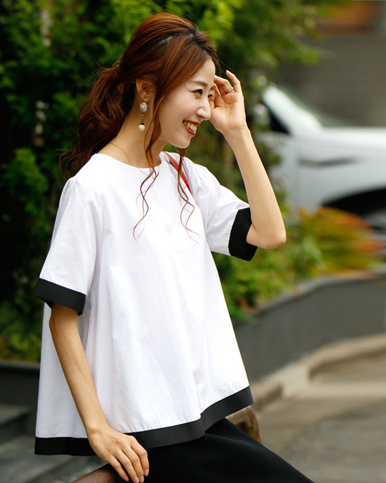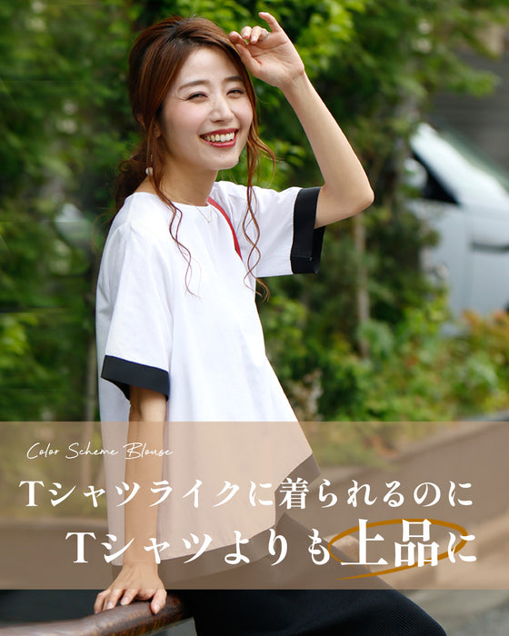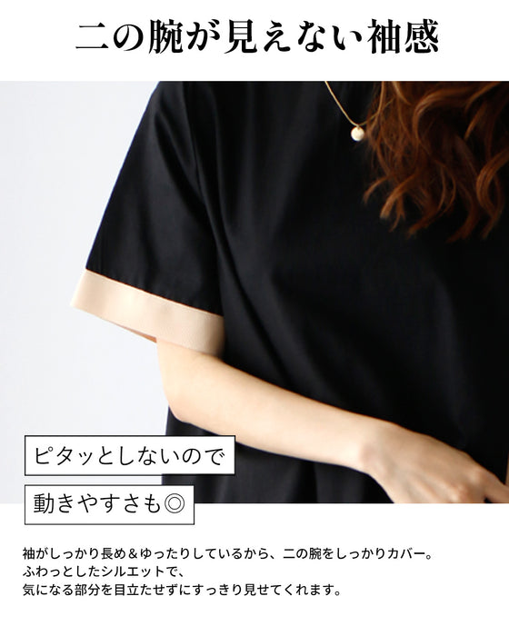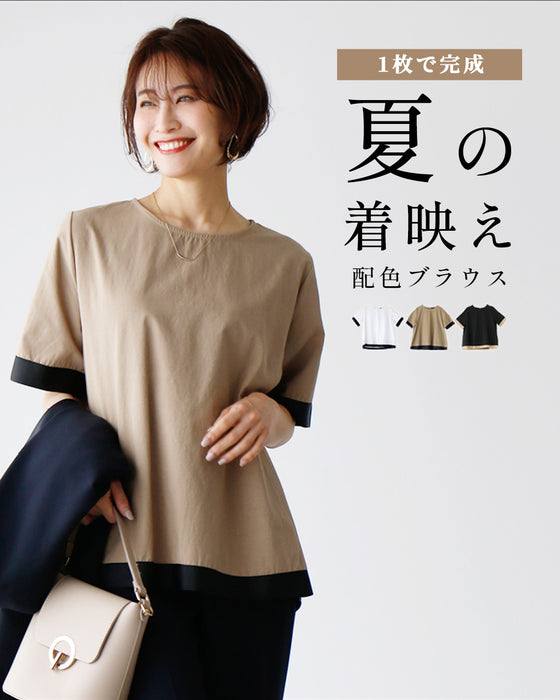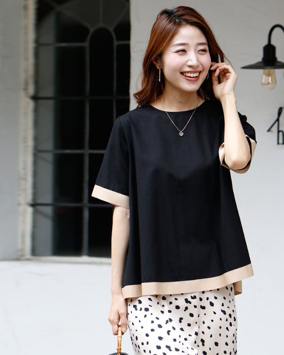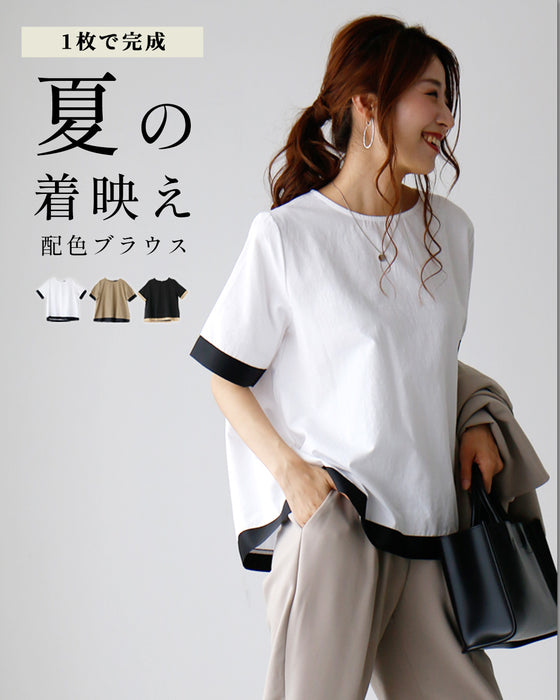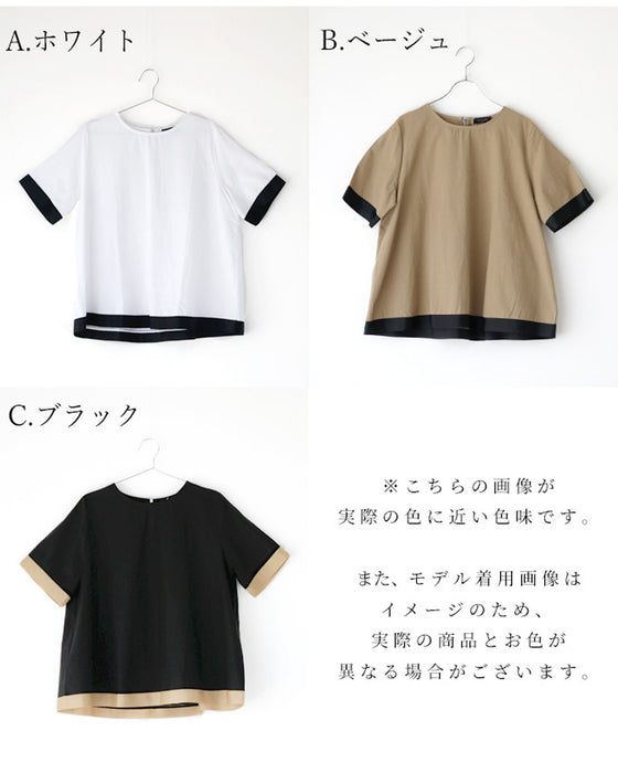 Blouse, short sleeve, figure covering, office casual blouse, women's, white, beige, black, white beige black, tops, women's, summer, 40s, color scheme, Ehre style, inner, piping, design top, flare, free shipping, fashion, free size, style, spring, summer, autumn, petite, Ehrestyle
