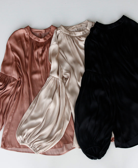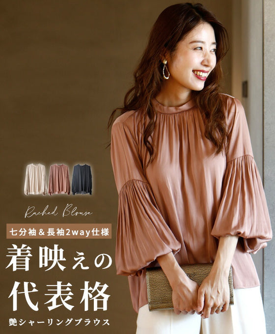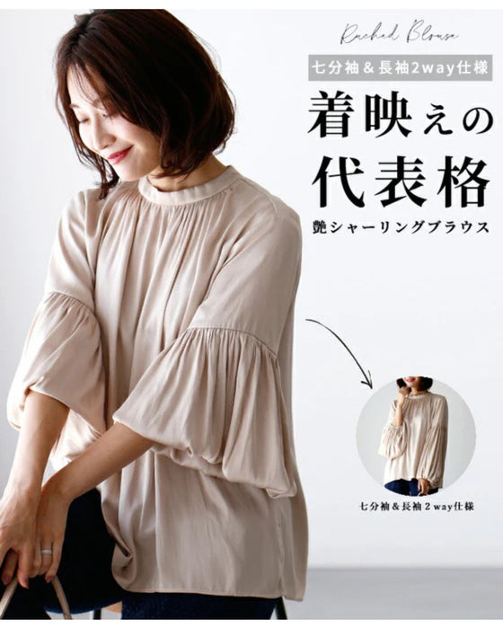 A glossy shirred blouse with 3/4 sleeves and long sleeves for a stylish look