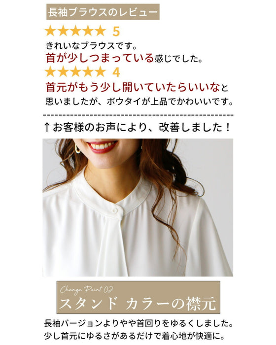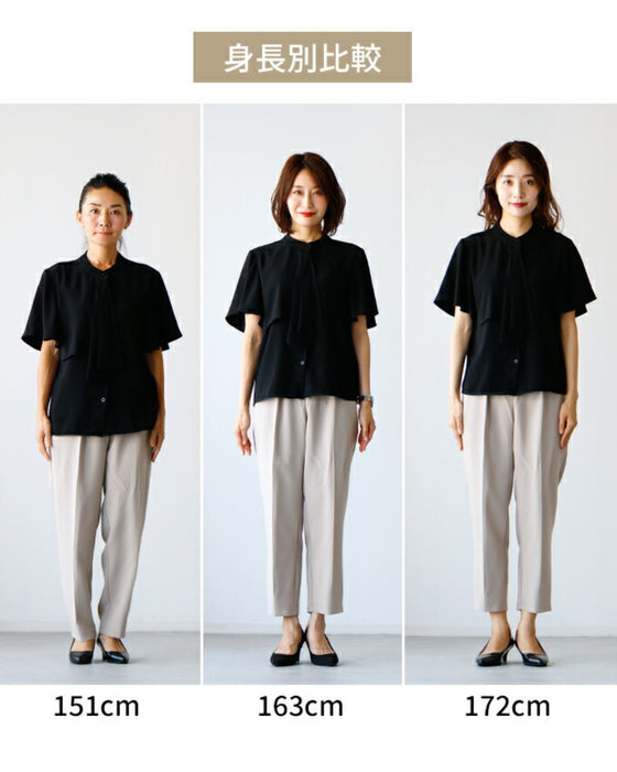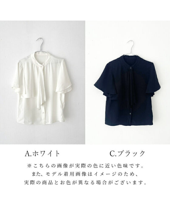 Tops, blouses, bow ties, bow tie blouses, short sleeves, elegant, black, white, plain, simple, work, original Ehre style, elegant, stand collar, covers the body, covers the upper arms, Ehre style, spring, summer, autumn, suitable for petite people, Ehrestyle, free size