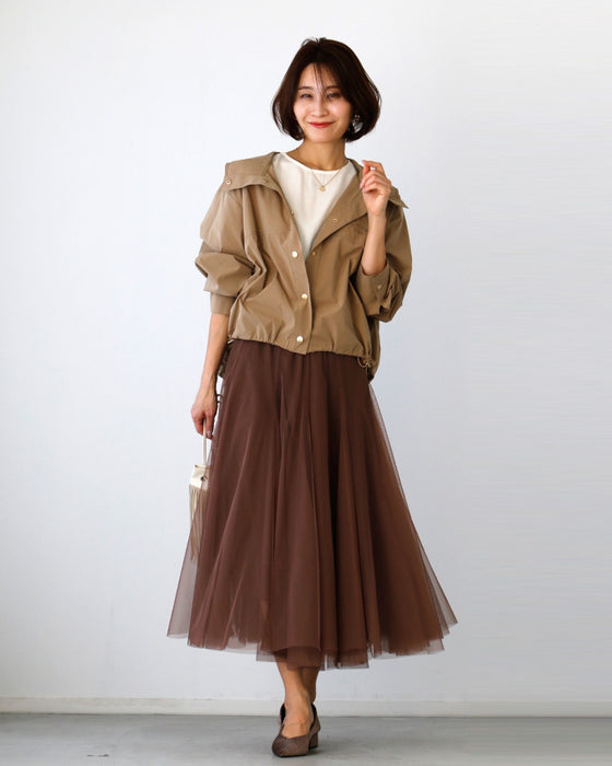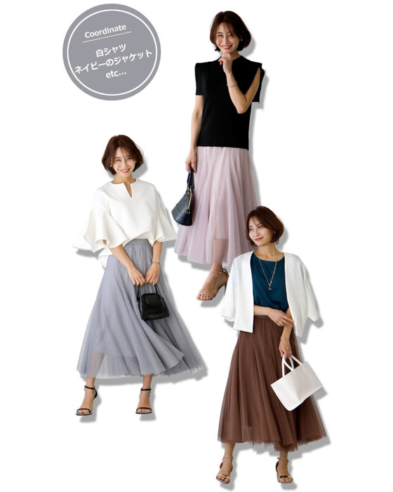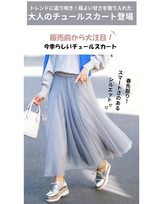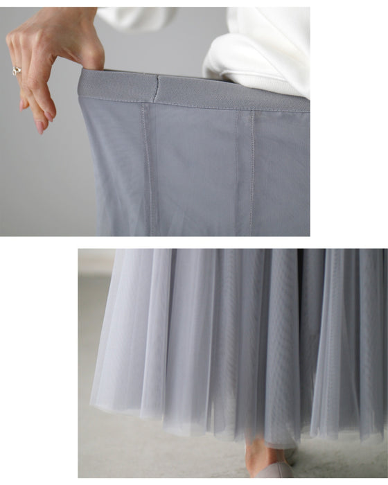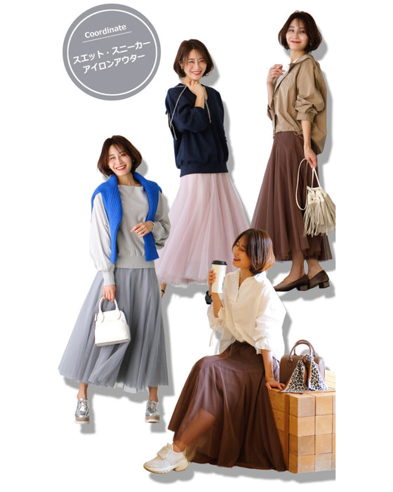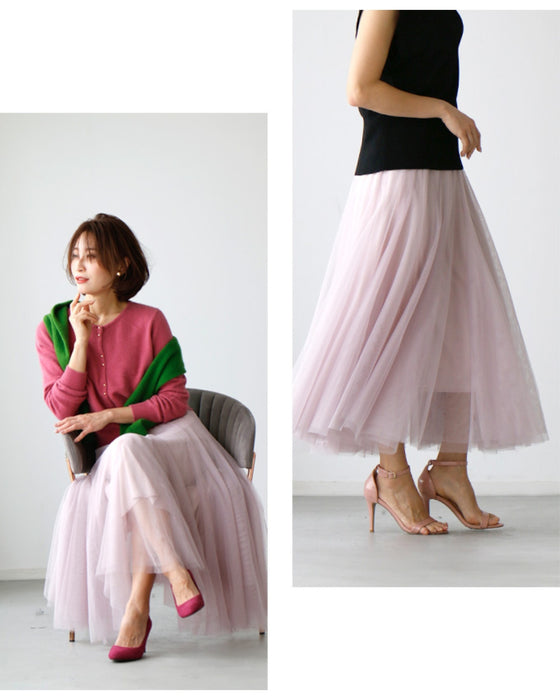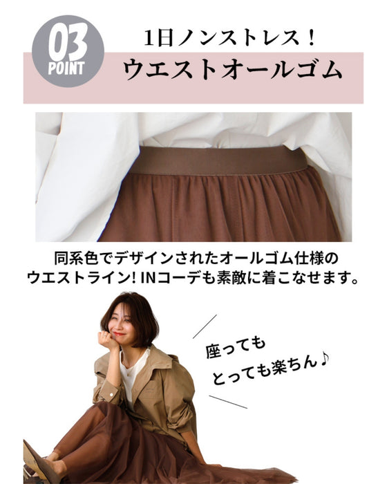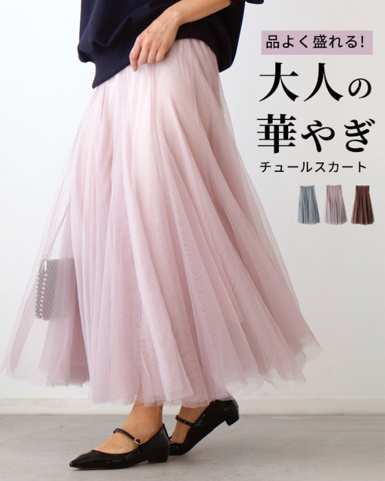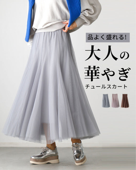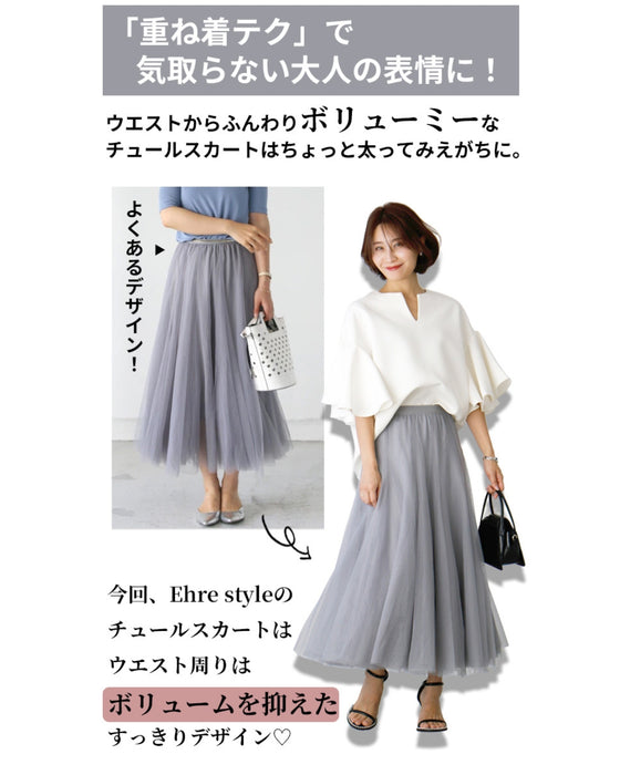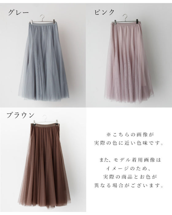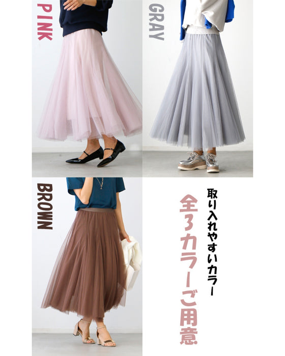 Tulle skirt, long skirt, flared skirt, elastic waist, soft, A-line, voluminous, women's fashion, long length, trendy, lining, full elastic, gorgeous, pink, gray, brown, Ehre style, one size fits all, also suitable for petite people, Ehrestyle