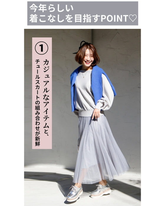 ① The combination of casual items such as sweatshirts, sneakers, and ironed outerwear with a tulle skirt is fresh.