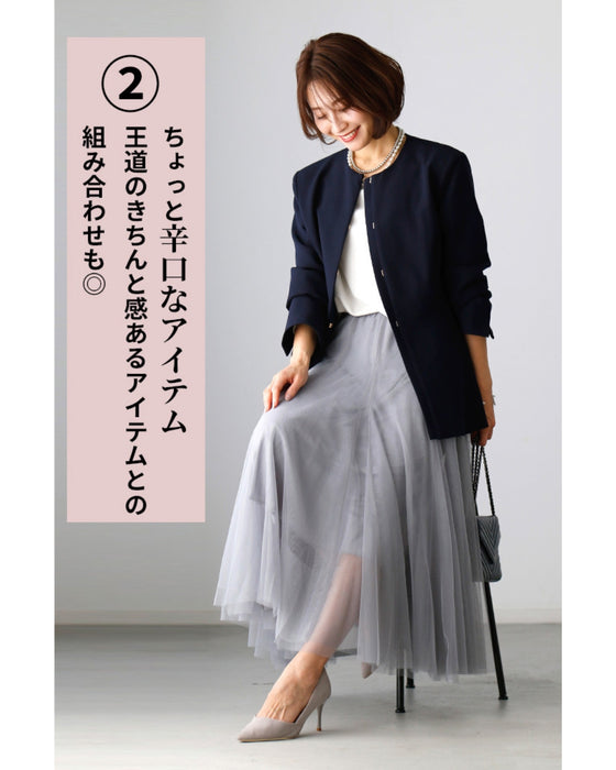 ② Pair it with something a little more dry. It also goes well with classic, neat items like a white shirt or navy jacket.