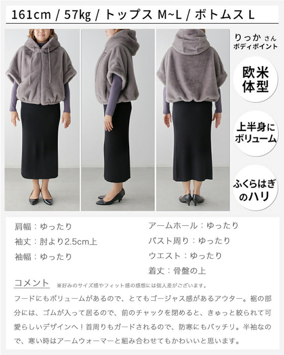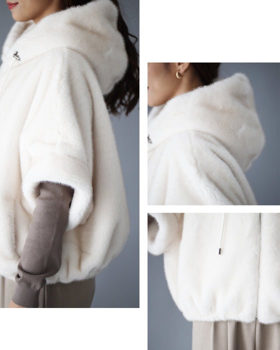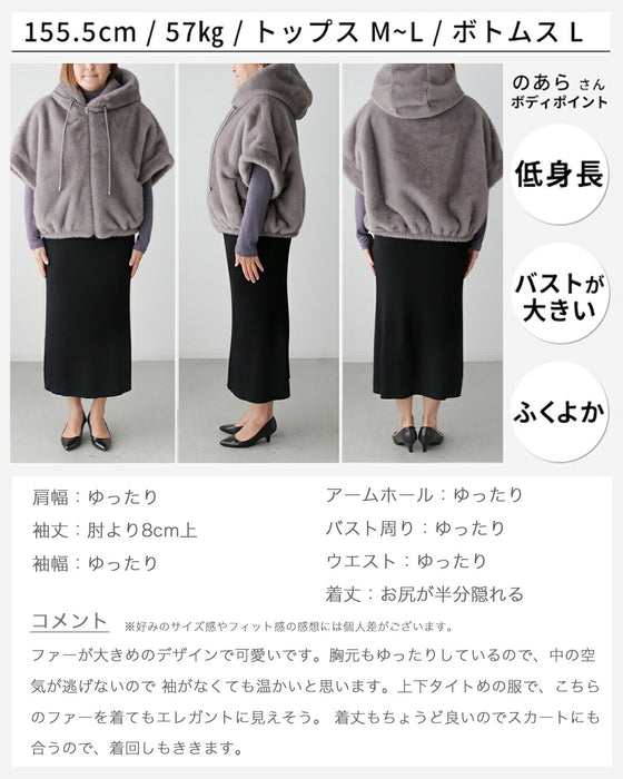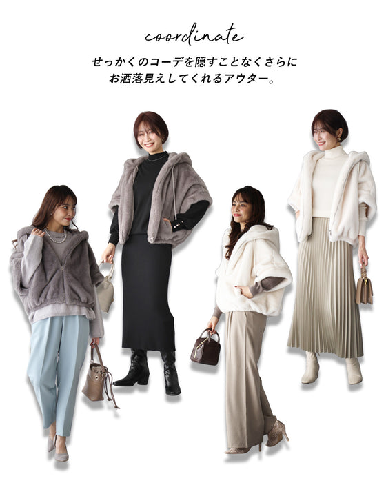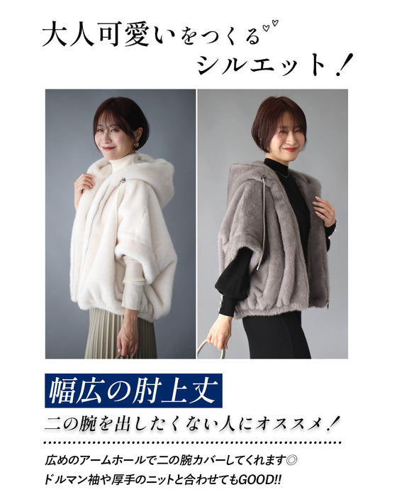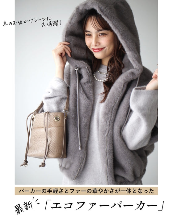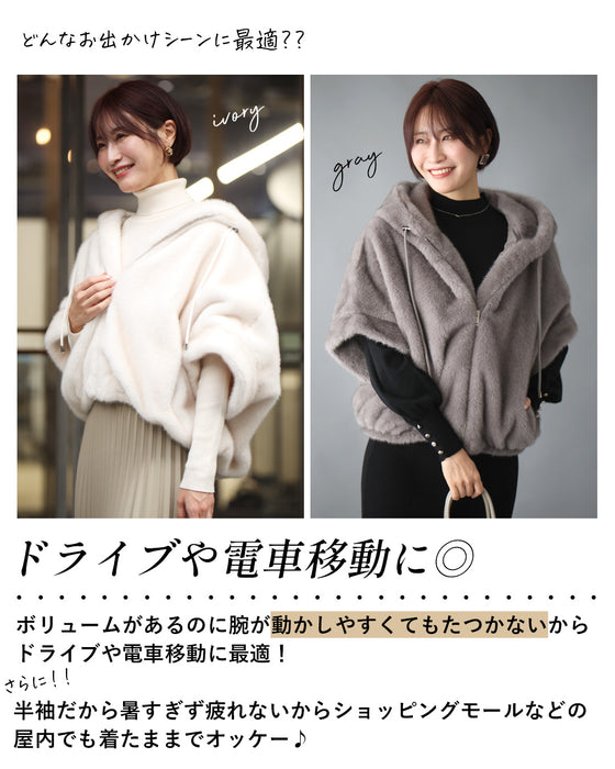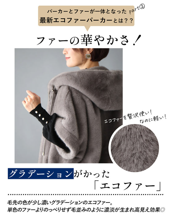 Parka, hood, eco-fur, outerwear, jacket, blouson, coat, layered, short sleeves, zipper, casual, stylish, faux fur, ivory, gray, autumn, winter, free size, women's fashion, Ehre style, style, Ehre style