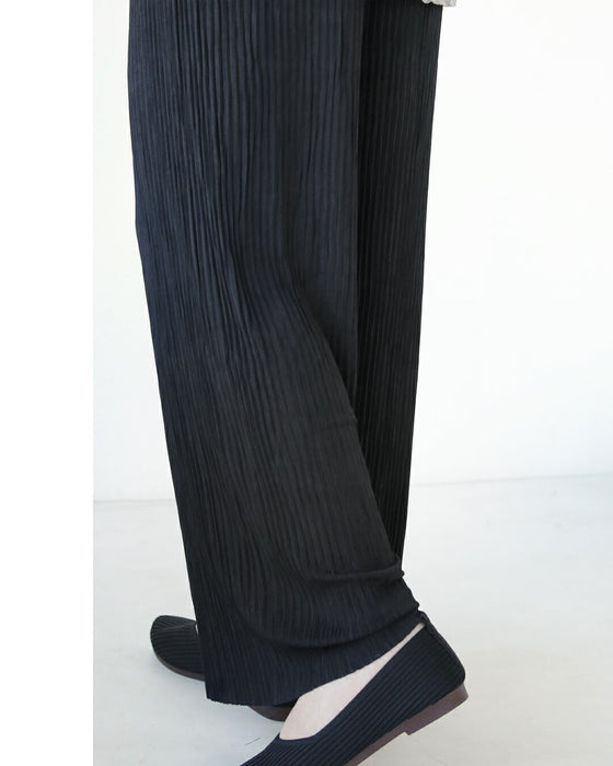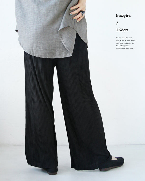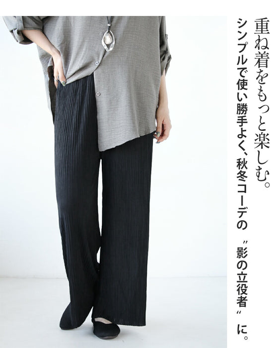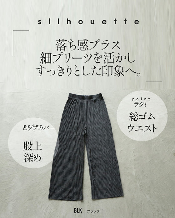ゆったりとしたシルエットで、窮屈感なく快適。 ウエストはゴム仕様で楽しく穿きながら落ち感プラス細プリーツを上品な印象へ。 ほどよいハリを持ち合わせ、シワができるくい所もポイント。