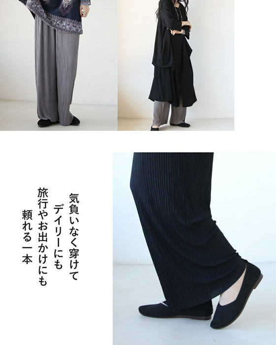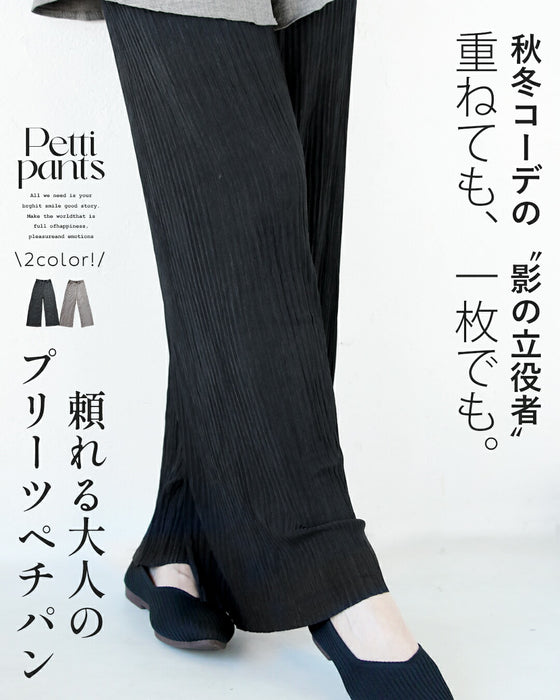 重ね着をもっと楽しむ。秋冬の必需品ペチパン。 ワンピースやチュニックの下に重ねて、レイヤードスタイルが楽しめる軽いプリーツペチパンツ。 美しい細プリーツ入りのフレアシルエット品で美脚効果もあり、1枚でも着ることも可能です。 縦ラインが動きに合わせて揺れ、大人らしい抜け感をプラス。 シンプルでよく抜ける、秋冬コーデの「影の立役者」に。