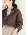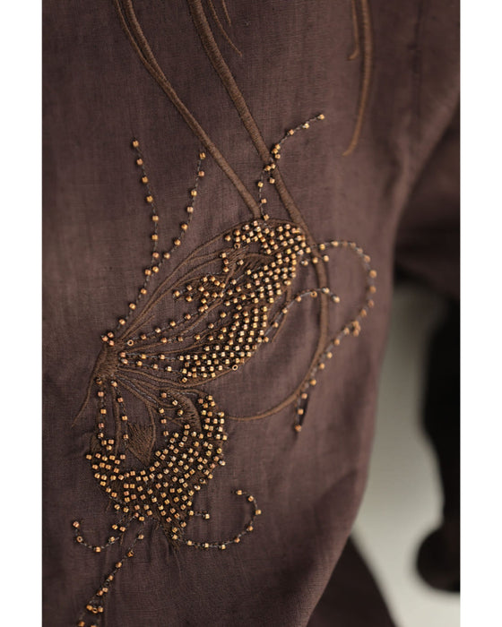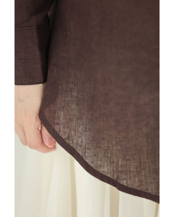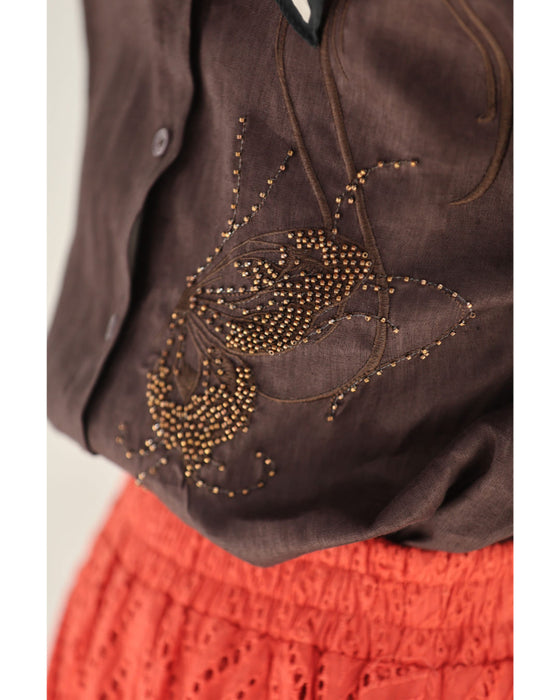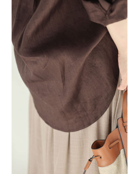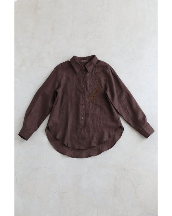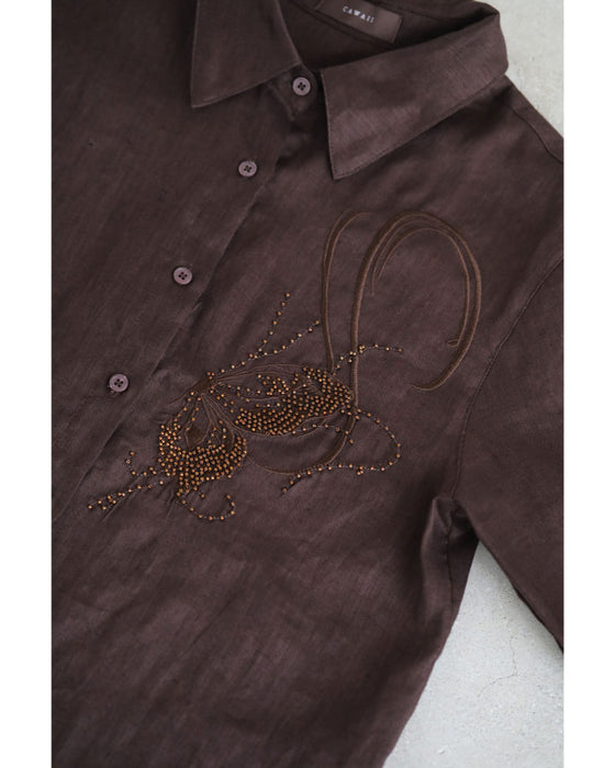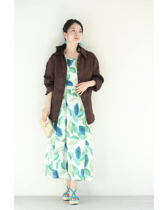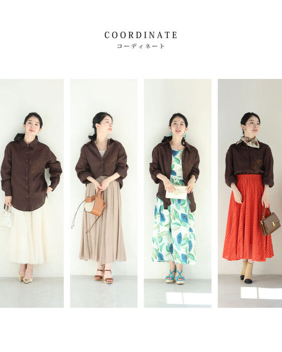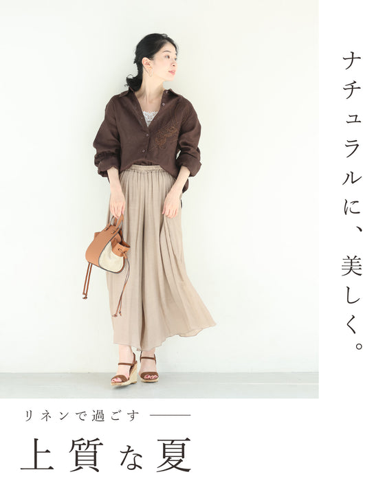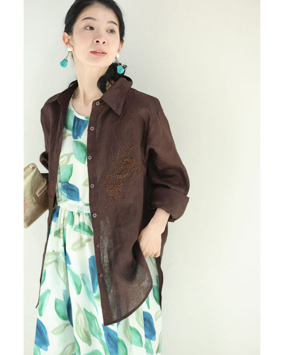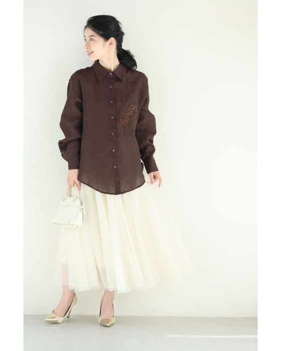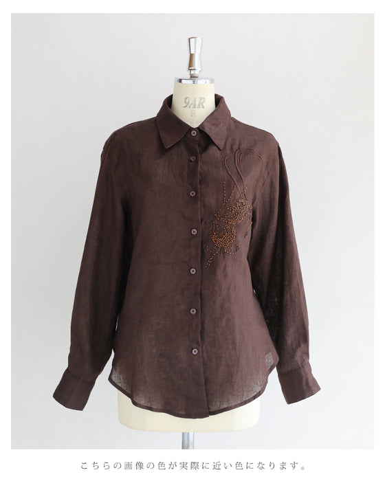 柔らかな風合いのリネン素材が心地よく、季節の移ろいを感じさせる一枚。落ち着いた味わいと上品なビジュー刺繍が、大人の上品な華を添えます。