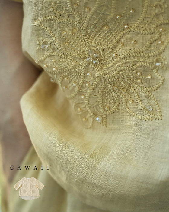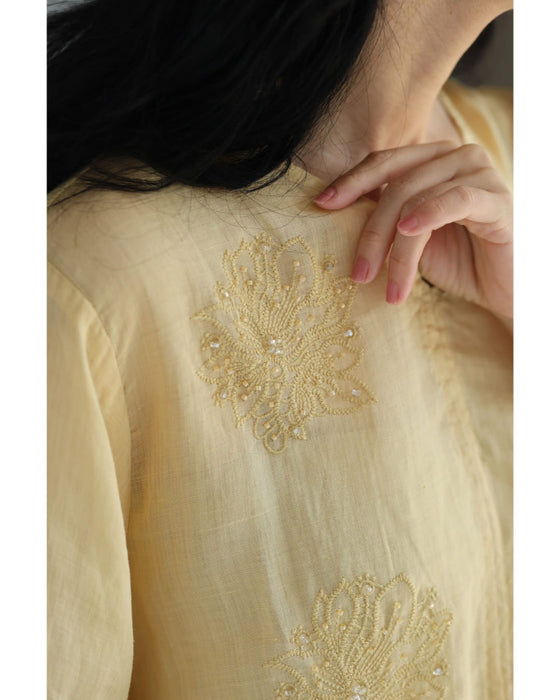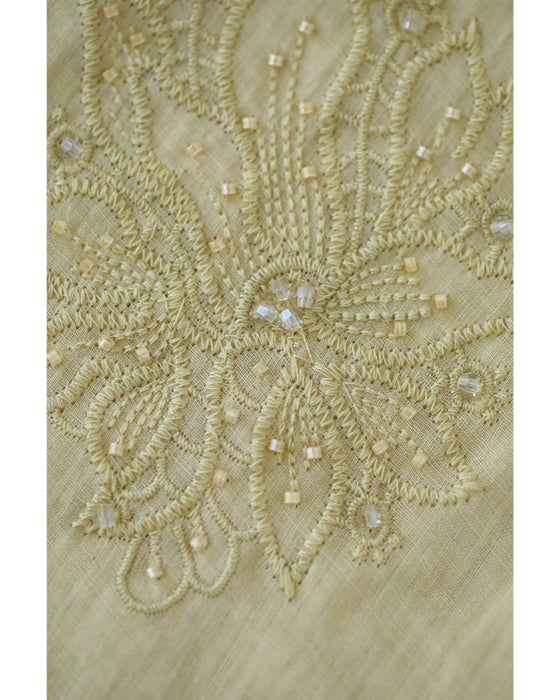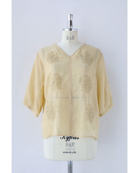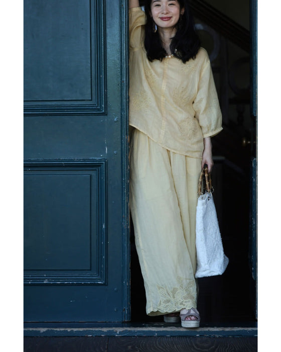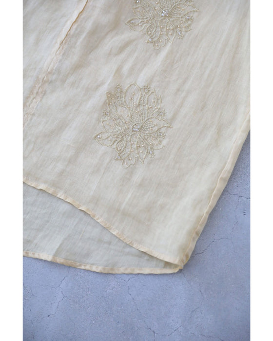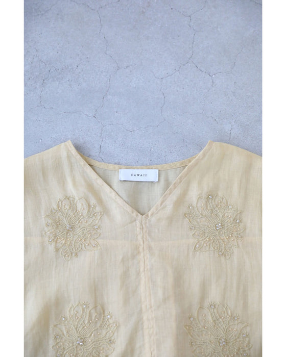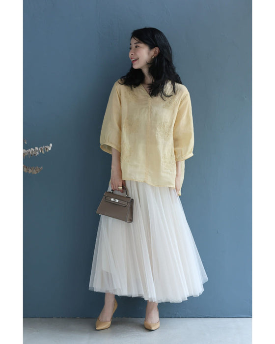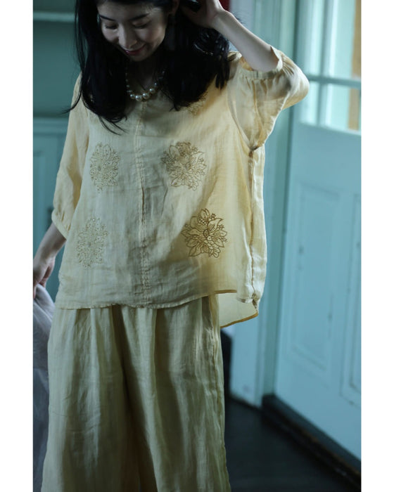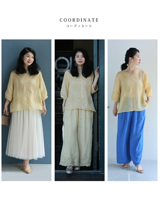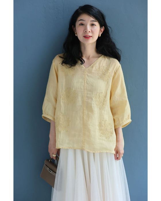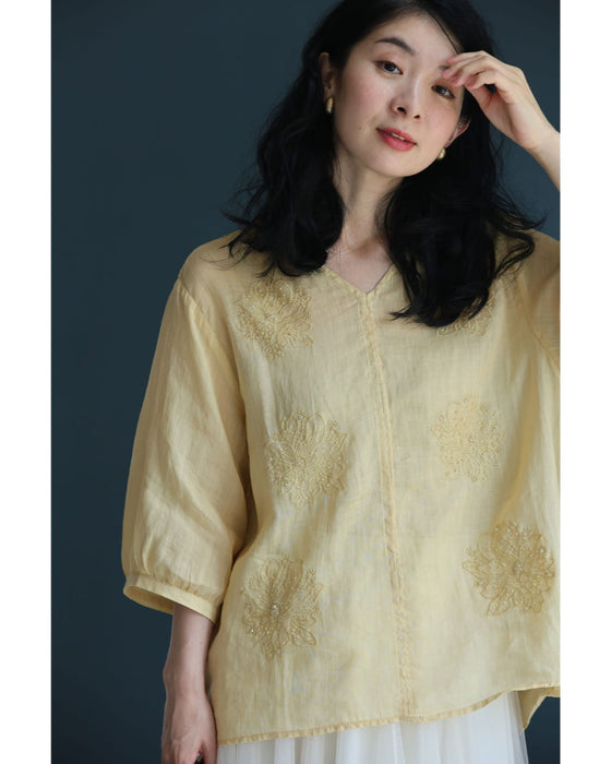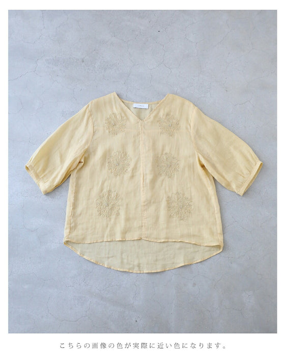 ビジュー煌めく花刺繍の柔らかリネンブラウストップス
