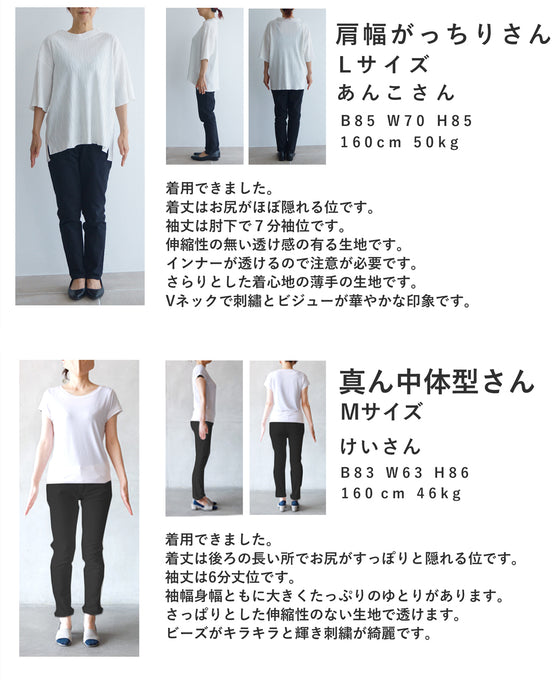 キラキラと控えめに輝くビジューがアクセントとなり、大人の装いに華やぎを添えてくれます。フロントはすっきりとしたVネックで、顔まわりも明るく見せてくれるデザインです。