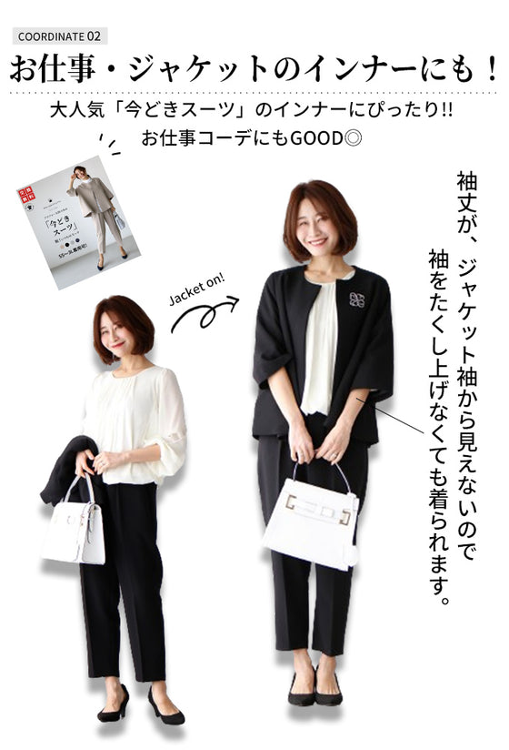 Tops, blouses, twist sleeves, pullovers, gathers, elegant, figure-covering, cool, spring, summer, 3/4 sleeves, simple, plain, ivory, blue, black, purple, work, daily, women's fashion, Ehre style, suitable for petite people, Ehrestyle, free size