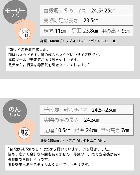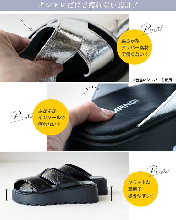 甲部分をしっかりホールドしてくれるデザインで、脱げにくく安定感も抜群。厚底でも歩きやすく、自然なスタイルアップも叶います。つっかけタイプなので圧迫感もなく、いつものサイズ選びでOK。