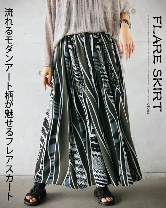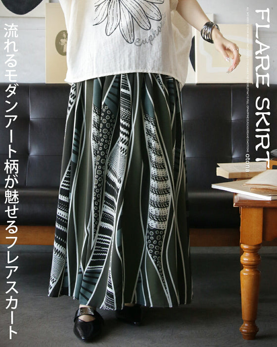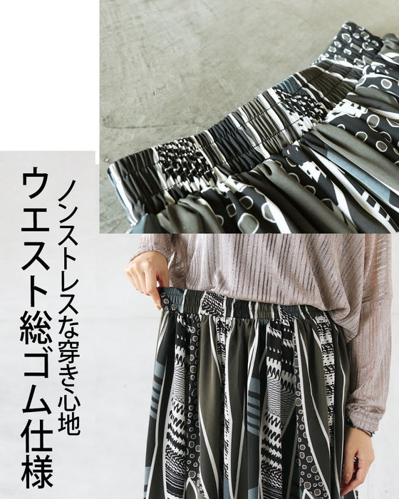 流れるようなラインが魅せる大胆でモダンなアート風プリントが目を惹くスカート。直線や曲線、ドットやストライプが重なり合い、他にはない個性的な存在感を演出。モノトーンベースにカーキやグレーを効かせ、大人の女性にも取り入れやすい落ち着いたカラーリングに仕上げました。たっぷりな生地のドレープ感がコーデを高見させ、ゆったりとした着心地を叶えてくれます。