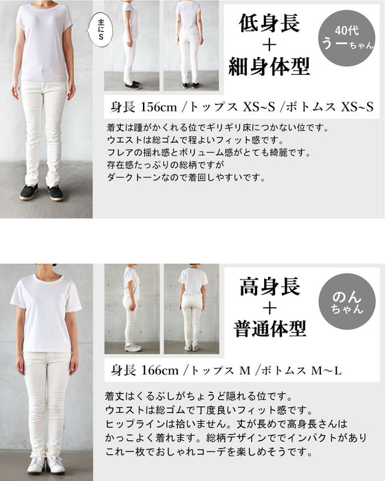 ウエストは総ゴム仕様でノンストレスなゆったりとした穿き心地。程よいボリューム感がありつつ、広がりすぎないシルエットなので体型カバーしつつスタイルアップも叶えます。