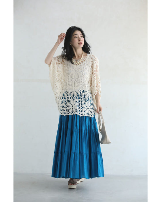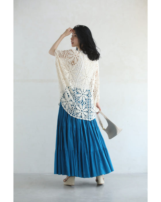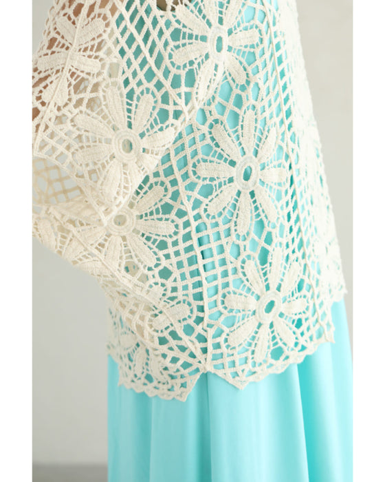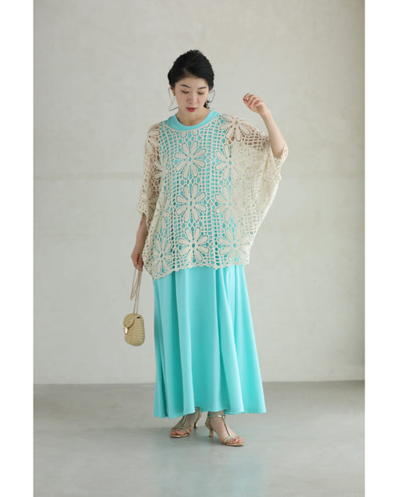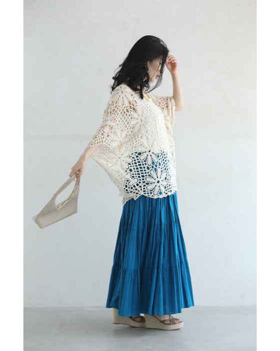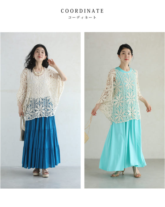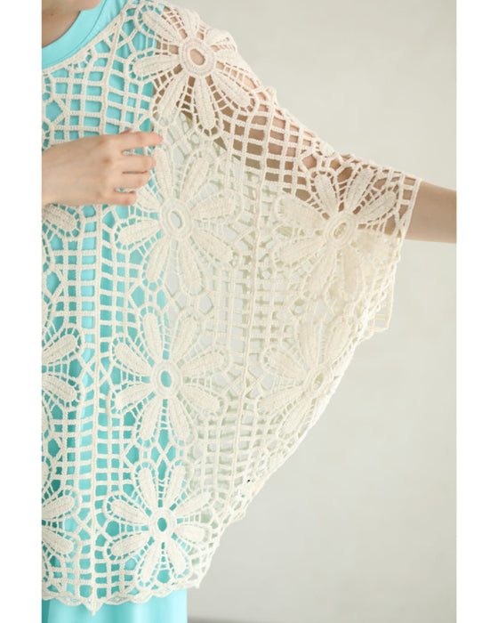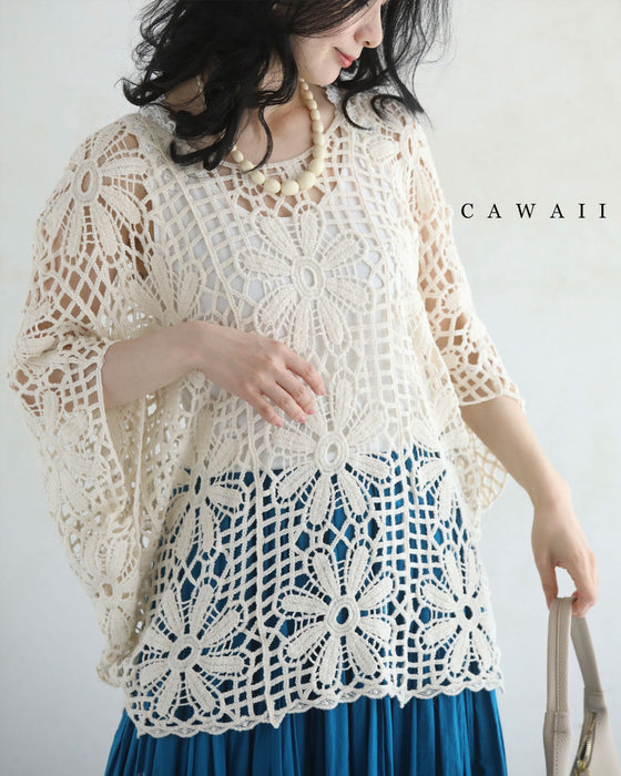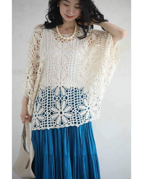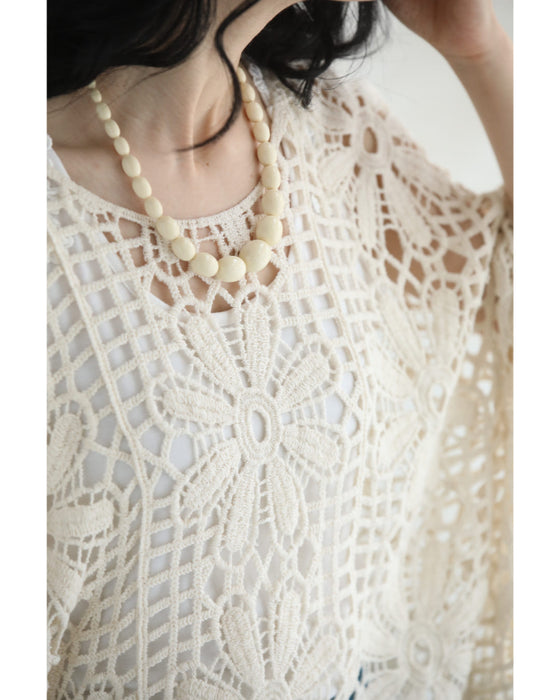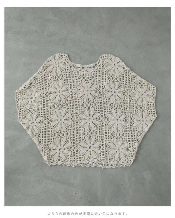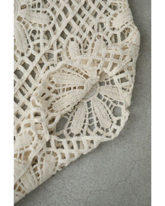 繊細レースで大人の余裕を演出。大胆な花柄のクロシェ編みが目を惹く一枚。透け感のある編み模様で、ヘルシーな肌見せを叶えながら、上品さも兼ね備えたデザインです。