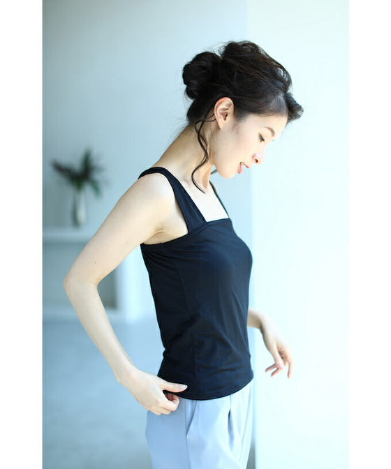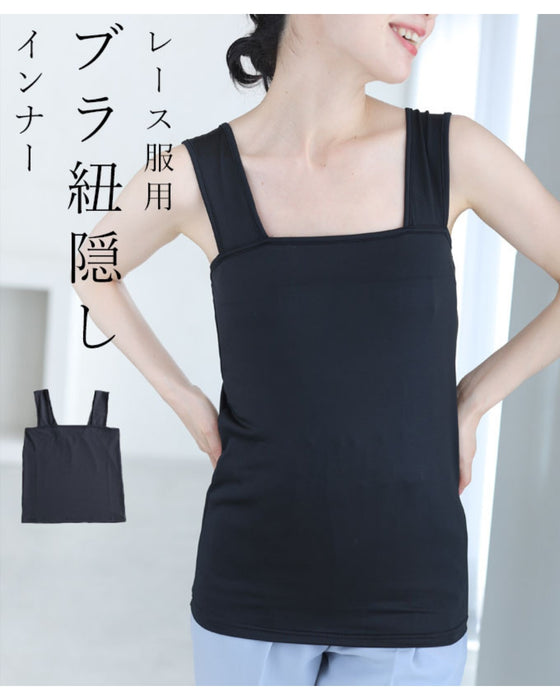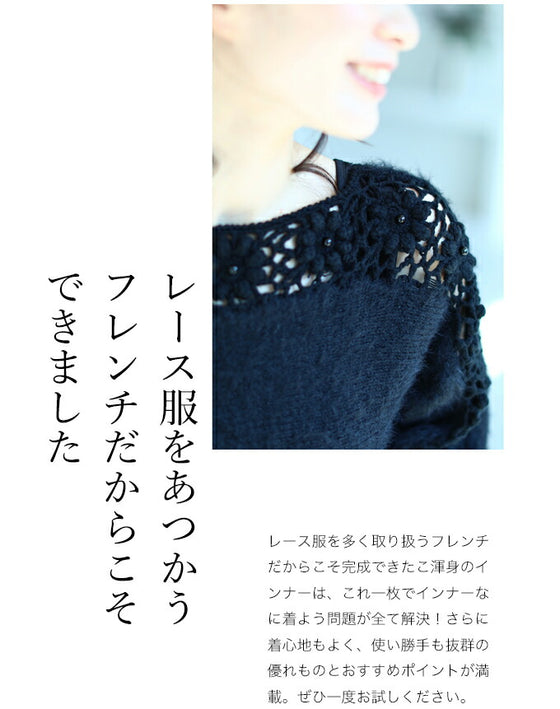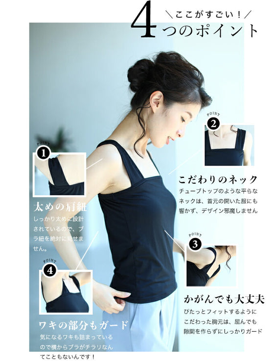 そんなお悩みを解決するのがこちらのインナー。肩紐が太めに設計されており、下着の紐をしっかり隠してくれるのに加えて、ネックはチューブトップのように平らなので、首元からインナーがはみ出してしまう心配もなく、お洋服の邪魔を一切しません。